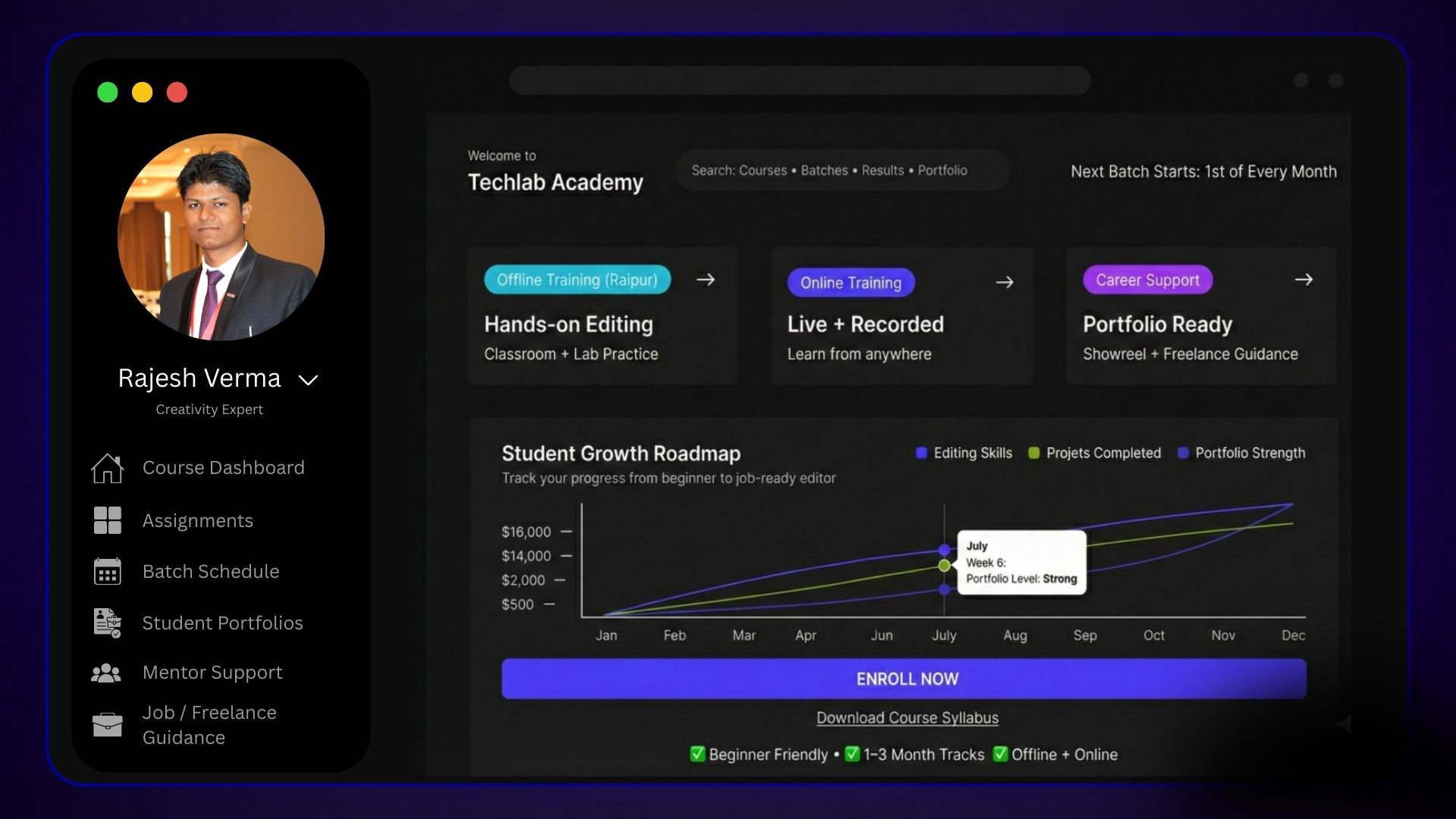 Course ne portfolio banane mein help ki – ab social media pe viral videos bana raha hoon. From zero followers to 5k in a month. Must-try!